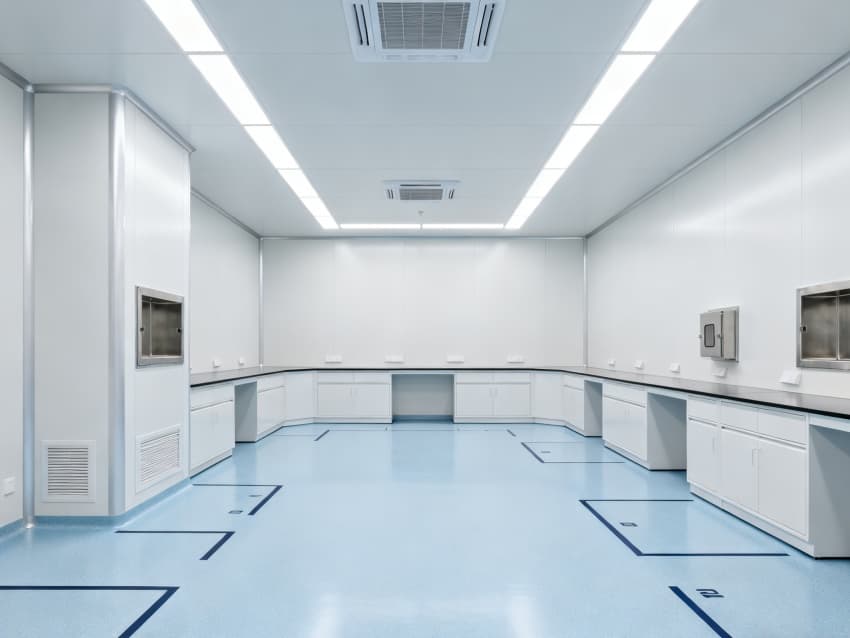 內(nèi)部6個(gè)實(shí)驗(yàn)室均為無(wú)設(shè)備空曠布局,按萬(wàn)級(jí)潔凈標(biāo)準(zhǔn)建設(shè):地面鋪設(shè)無(wú)縫抗菌環(huán)氧自流平,墻面采用食品級(jí)不銹鋼潔凈墻板,陰陽(yáng)角做R40圓弧處理杜絕積塵死角;柱網(wǎng)間距設(shè)為7.5米,預(yù)留實(shí)驗(yàn)臺(tái)、精密檢測(cè)設(shè)備安裝點(diǎn)位及運(yùn)維通道;頂部整合高效新風(fēng)過(guò)濾系統(tǒng)、恒溫恒濕裝置與防眩光LED照明,所有管線暗藏于吊頂內(nèi),最大化釋放空間高度與視野;實(shí)驗(yàn)室間通過(guò)通透玻璃隔斷銜接,進(jìn)一步強(qiáng)化整體空曠感,為藥物合成、質(zhì)量檢測(cè)等核心研發(fā)環(huán)節(jié)提供安全、潔凈的專屬環(huán)境。