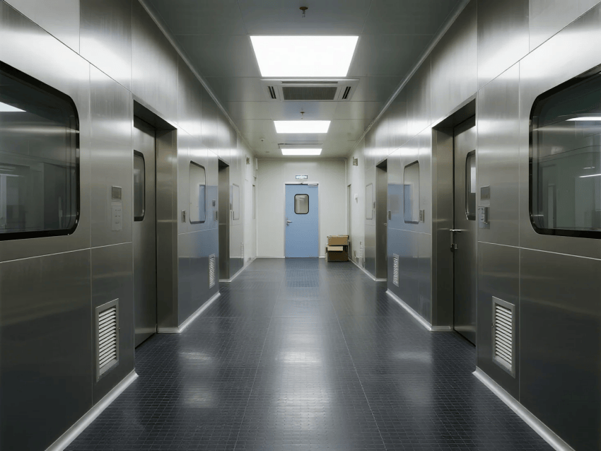 地面系統:深灰鋁合金防靜電格柵地板,開放率≥60%,電阻值10^4~10^6Ω,下方設置2米深架空層,集成管線與FFU回風系統;