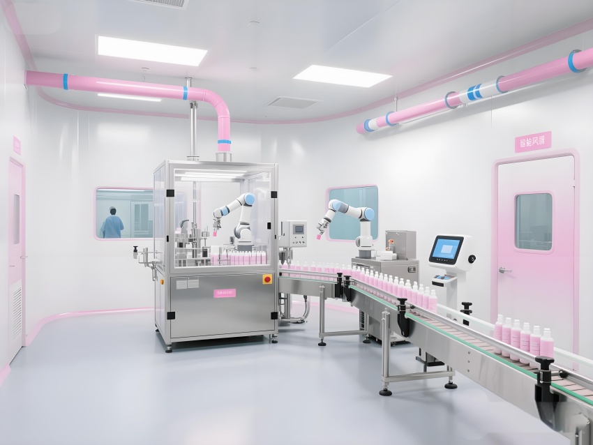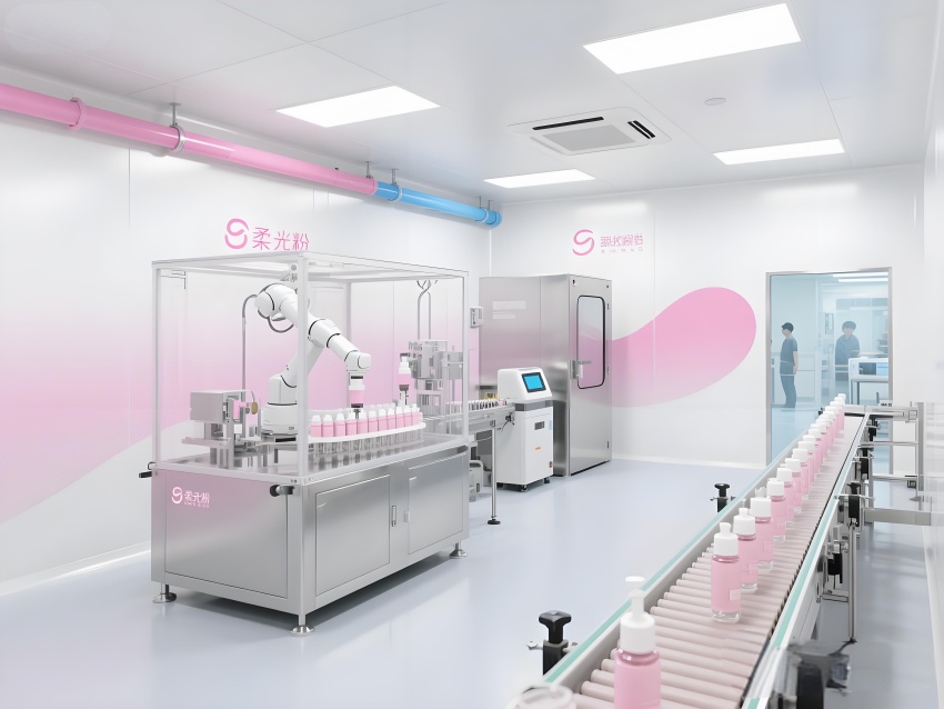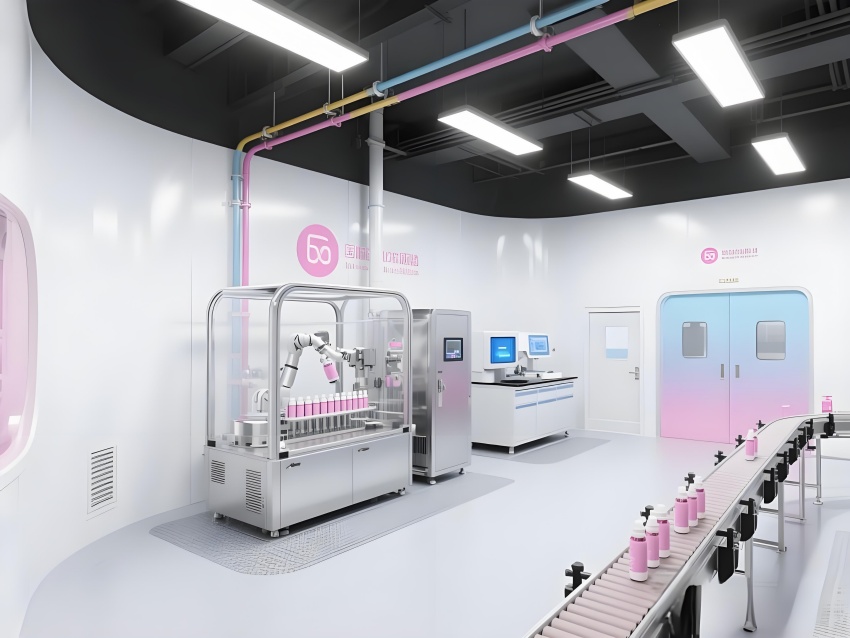 本車間以“科技感純凈美學”為設計語言,將化妝品行業(yè)的精致基因融入工業(yè)空間。純白主色調搭配品牌標志性的柔光粉點綴,墻面圓弧過渡的彩鋼板與地面淺灰導靜電地板構成潔凈基底。核心灌裝區(qū)透明層流罩內,機械臂精準抓取瓶體灌裝,冷銀色設備與粉色功能標識形成視覺對比。頂棚均勻分布的LED平板燈在乳化區(qū)投下無影光效,原料輸送管道通過色環(huán)編碼清晰區(qū)分。質檢實驗室的藍光檢測儀與包裝區(qū)高速傳送帶上的產品流,共同構建高效生產韻律。人員通道的智能風淋室采用漸變色玻璃,科技感與人性化并存。整體空間通過嚴格的功能分區(qū)與柔和的色彩管理,打造符合國際標準的化妝品智造殿堂。