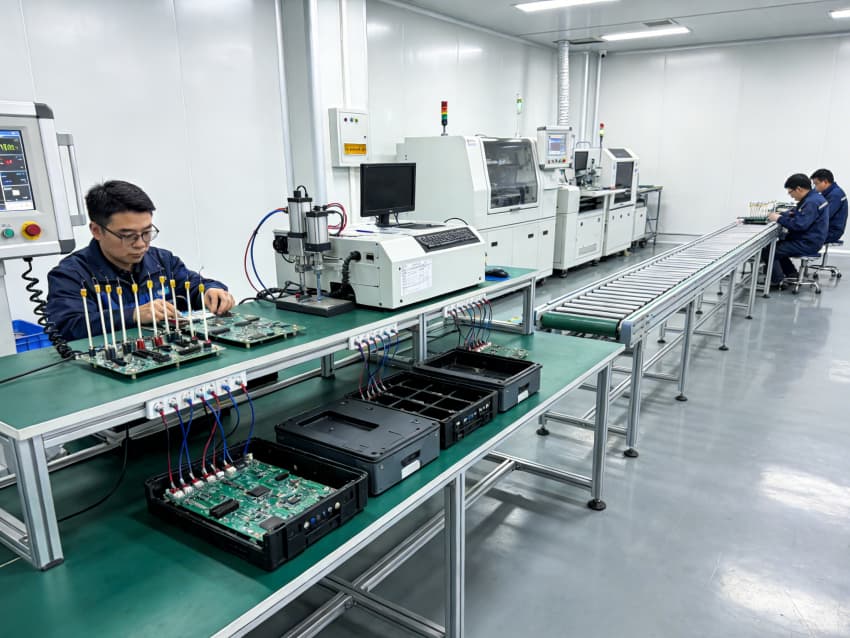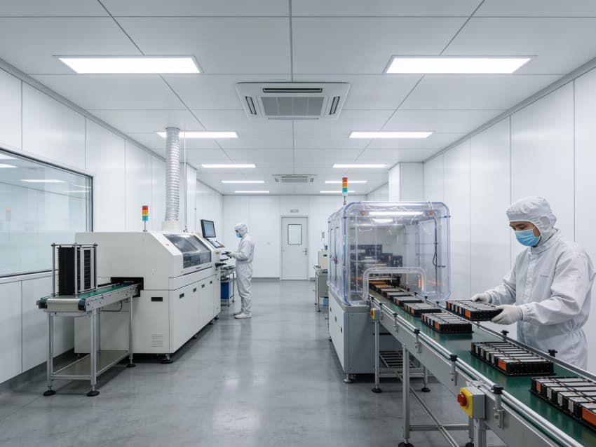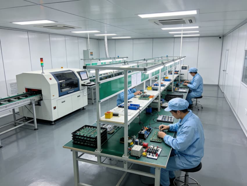 手工組裝與測(cè)試區(qū):采用模塊化防靜電工作臺(tái)布局,每個(gè)工位配備獨(dú)立電源接口與靜電手環(huán)接地端,線性燈帶提供均勻照明,旁側(cè)通風(fēng)系統(tǒng)有效驅(qū)散焊接產(chǎn)生的熱量與煙塵。
