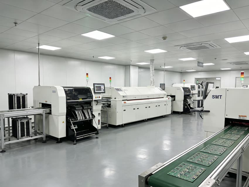 SMT 核心生產(chǎn)區(qū):針對(duì)高速貼片機(jī)、回流焊等設(shè)備做了地面承重加固與管線預(yù)埋,配置伸縮式通風(fēng)除塵管道,及時(shí)收集焊煙與粉塵;防靜電工作臺(tái)搭配 LED 工位燈,保障貼片、焊接的精度與效率。