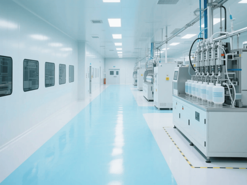地面系統(tǒng)采用3mm厚環(huán)氧防靜電自流平工藝,表面電阻值穩(wěn)定控制在10^6-10^9Ω,摩擦系數(shù)0.6-0.8,滿足精密電子制造對(duì)地面的特殊要求。吊頂系統(tǒng)采用FFU+HEPA高效過(guò)濾組合,換氣次數(shù)≥25次/h,維持穩(wěn)定的層流狀態(tài)。功能分區(qū)通過(guò)淺藍(lán)色環(huán)氧劃線清晰標(biāo)識(shí),設(shè)備區(qū)采用啞光白不銹鋼包邊處理。