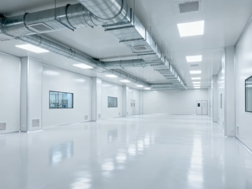 內(nèi)部6個核心生產(chǎn)車間均為無設(shè)備空曠布局,按萬級潔凈標(biāo)準(zhǔn)打造:地面鋪設(shè)無縫環(huán)氧自流平,墻面采用食品級不銹鋼墻板,陰陽角做圓弧處理,杜絕積塵死角;空間柱網(wǎng)間距均勻,預(yù)留充足設(shè)備安裝點位與運維通道,滿足后續(xù)柔性生產(chǎn)需求;頂部吊頂整合新風(fēng)系統(tǒng)與防眩光照明模塊,風(fēng)口布局對稱規(guī)整,進一步強化空間的空曠感與規(guī)整性,為生物制藥生產(chǎn)的潔凈性、安全性與可擴展性奠定堅實基礎(chǔ)。