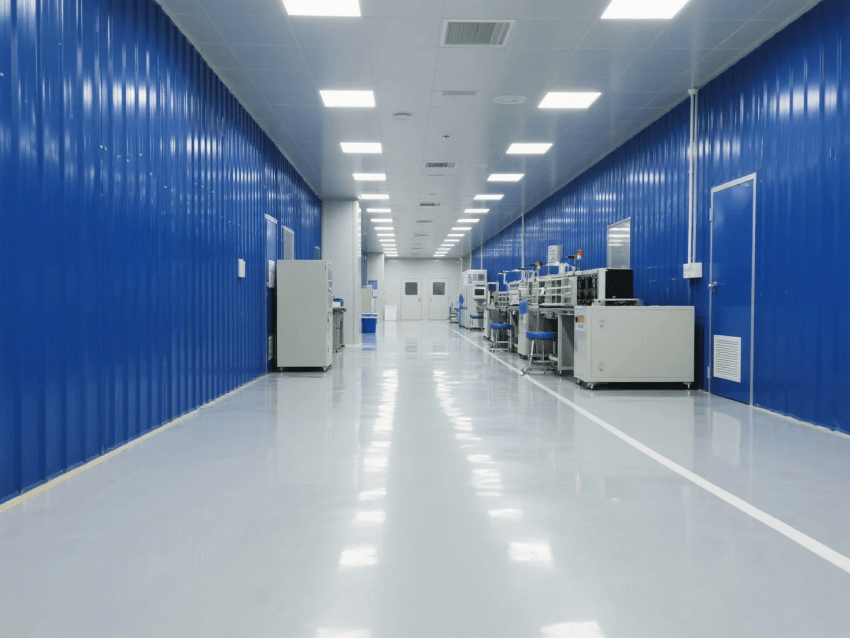 本工程嚴格遵循ISO14644-1Class8標準,采用"工業科技風"設計理念,打造現代化電子零件制造環境。車間以深藍彩鋼板墻體與淺灰防靜電環氧地坪形成鮮明視覺對比,營造兼具科技感與功能性的生產空間。