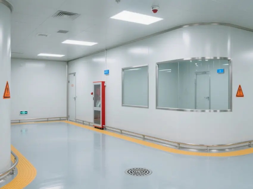 整個車間以白色為主色調,營造出干凈、整潔的氛圍。地面是光滑的淺灰色,帶有黃色的警示線,確保人員行走安全。車間內的墻壁和天花板都采用了平整的設計,便于清潔。