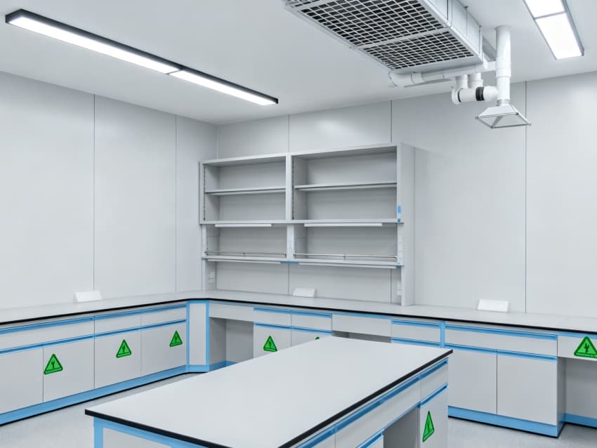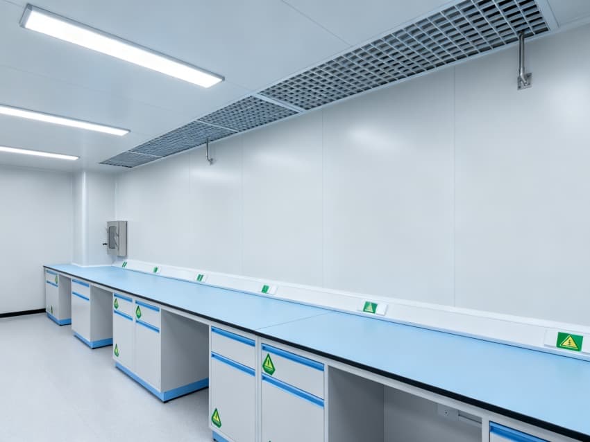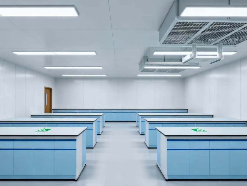 在核心操作區(qū)域,我們執(zhí)行的是高標(biāo)準(zhǔn)的潔凈要求,每立方米空氣里直徑0.5微米以上的灰塵、顆粒等雜質(zhì)不能超過(guò)352000個(gè),相當(dāng)于達(dá)到了萬(wàn)級(jí)潔凈標(biāo)準(zhǔn)(國(guó)際ISO8級(jí))。而像走廊、儲(chǔ)物間這些輔助區(qū)域,要求會(huì)稍微低一些,執(zhí)行的是十萬(wàn)級(jí)潔凈標(biāo)準(zhǔn)(國(guó)際ISO9級(jí))。采用初效-中效-高效三級(jí)空氣過(guò)濾系統(tǒng),配合側(cè)送頂回氣流設(shè)計(jì),實(shí)現(xiàn)每小時(shí)18-22次空氣置換;墻面選用耐酸堿潔凈彩鋼板,地面為防滑PVC無(wú)菌卷材,所有邊角做圓弧密封處理,減少清潔死角。室內(nèi)溫度穩(wěn)定在22±2℃,相對(duì)濕度控制在45%-55%,關(guān)鍵實(shí)驗(yàn)區(qū)維持微正壓,有效隔絕外界污染與交叉感染,既符合高校生物實(shí)驗(yàn)教學(xué)規(guī)范,也為科研數(shù)據(jù)準(zhǔn)確性提供可靠環(huán)境保障。